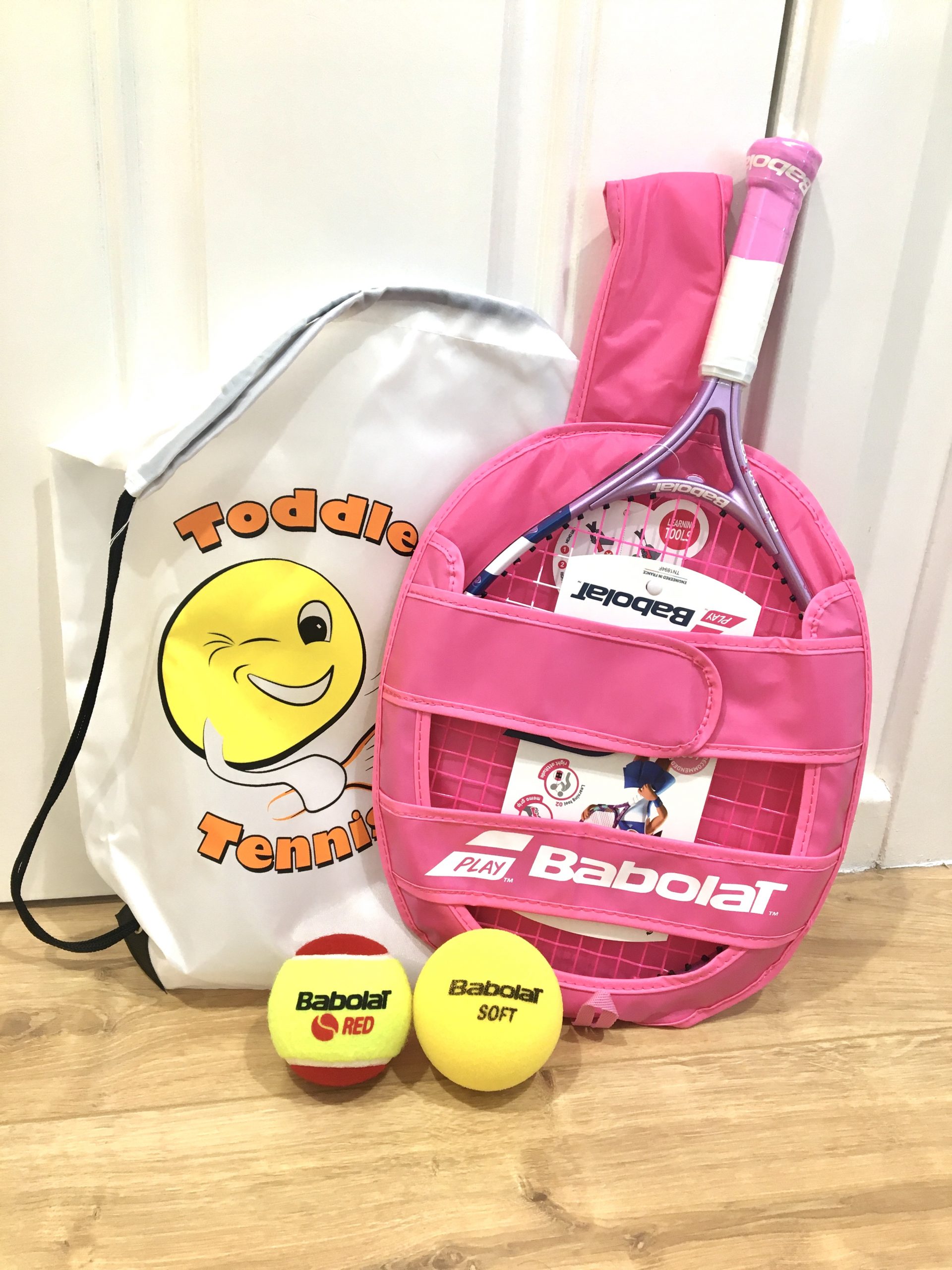 Our Toddler Tennis starter pack is great for any budding tennis players looking to practice wherever they go! It includes a portable white Toddler Tennis string bag, 1x red felt tennis ball (outdoor), 1x sponge tennis ball (indoor) and a 19 inch B’fly Babolat racket (2020 edition).